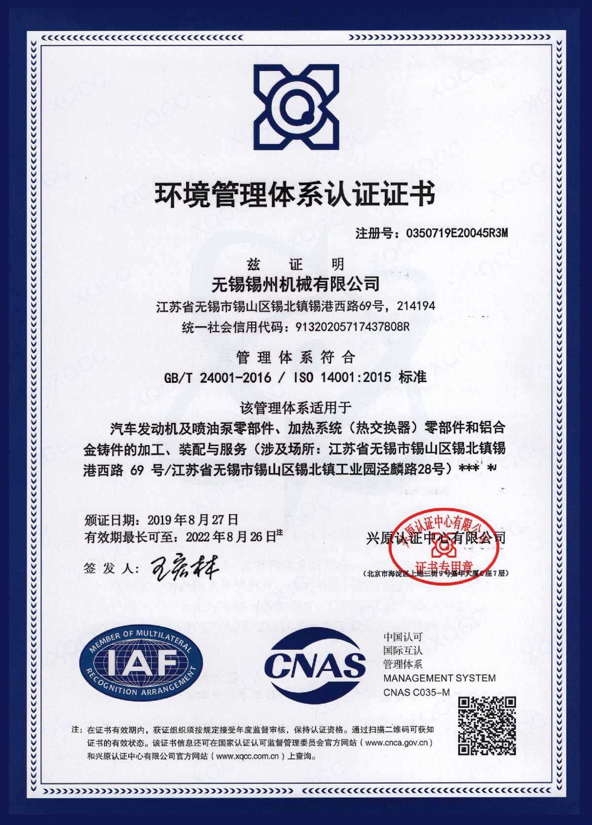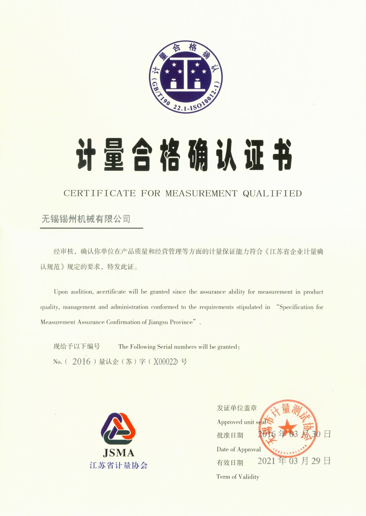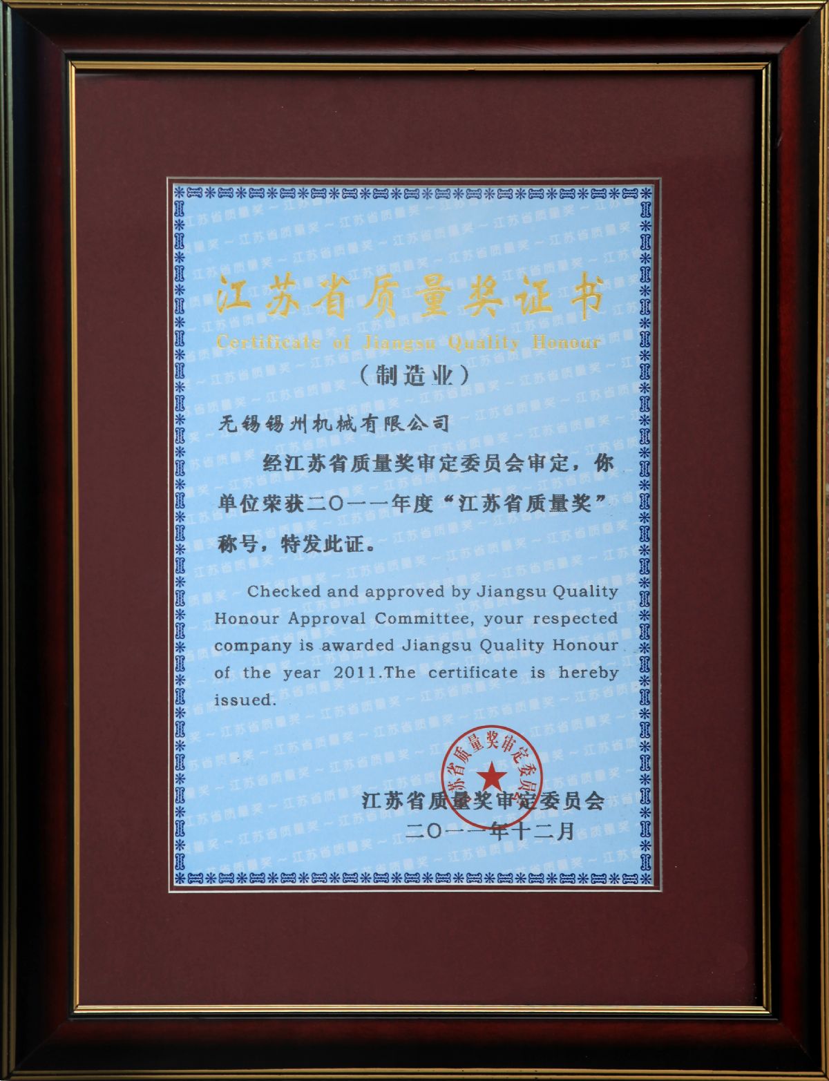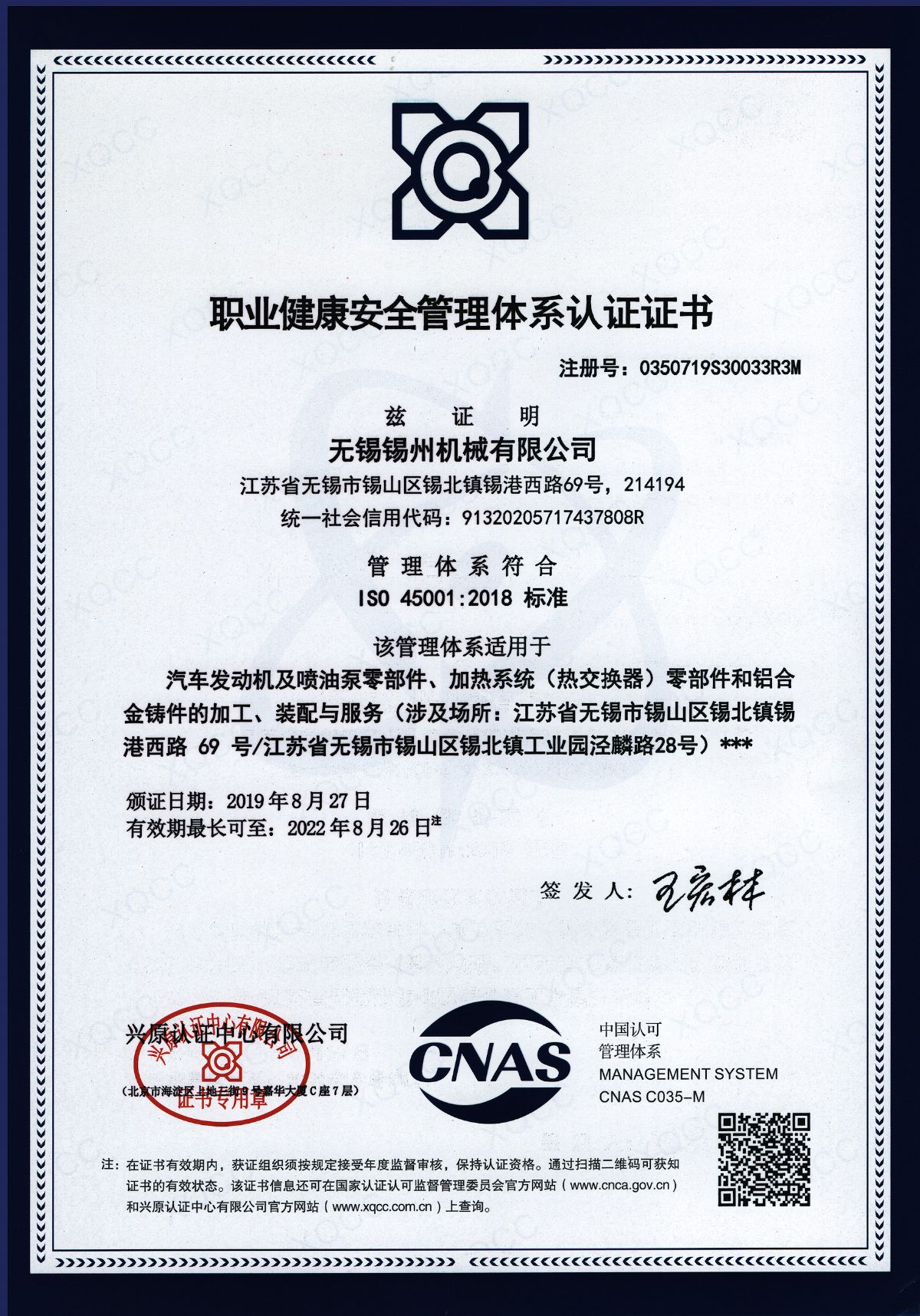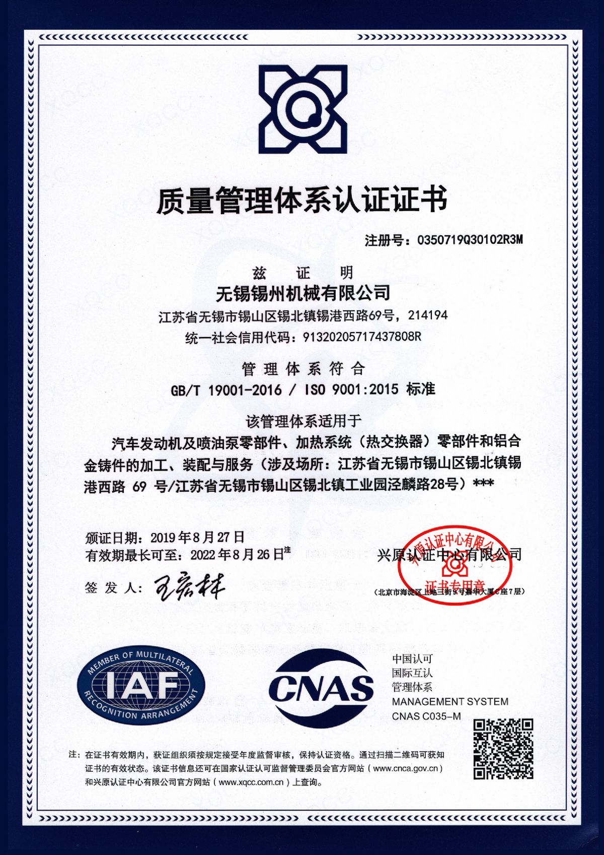 “ 以质量求生存,以管理增效益”是锡州机械坚定不渝的经营理念;“质量第一、客户至上”是锡州机械坚持不懈的追求;“ 以人为本,铸就优质产品, 精益求精,增强顾客满意”是锡州机械持之以恒的质量方针。 2001年7月公司通过ISO9001:2000质量体系认证, 2005年9月通过ISO/TS16949质量体系认证。公司于2007年7月通过产品ASME认证。 通过开展以产品质量为中心的企业管理,公司以先进的生产检测设备、完善的质量保证体系、严密的产品开发体系、严格按照标准开展产品生产管理,并开展6S现场管理,竭尽全力创造一个比较清洁、健康、安全的环境,全方位地满足国内外客户的要求。